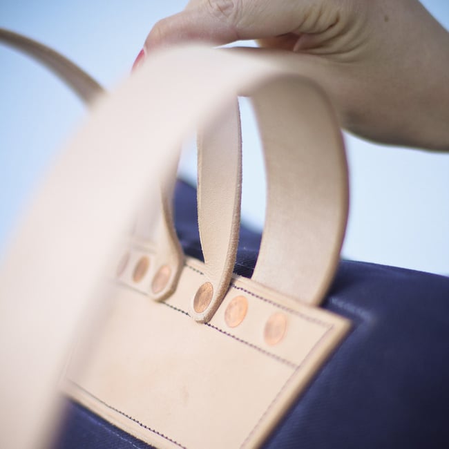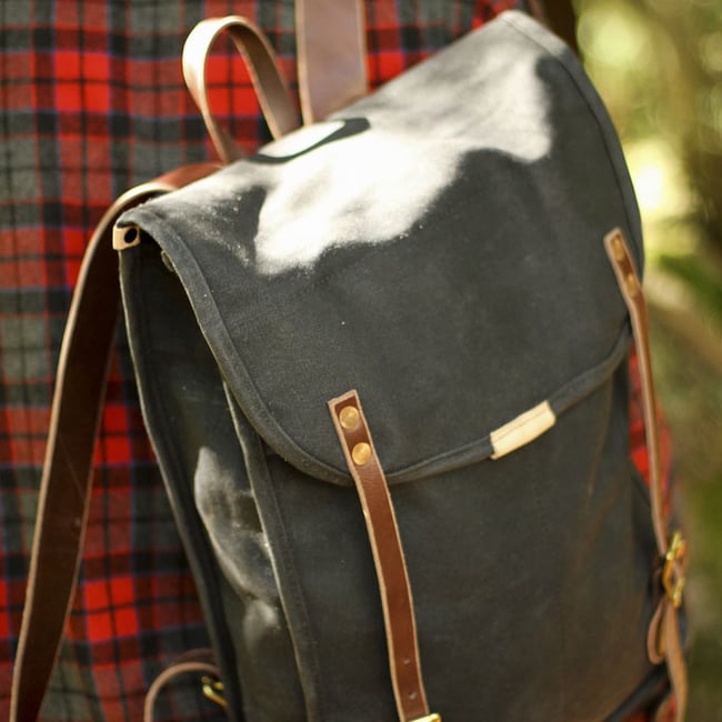 Materials: #10 Waxed Canvas (15oz), leather, Solid brass roller buckles, copper rivets.